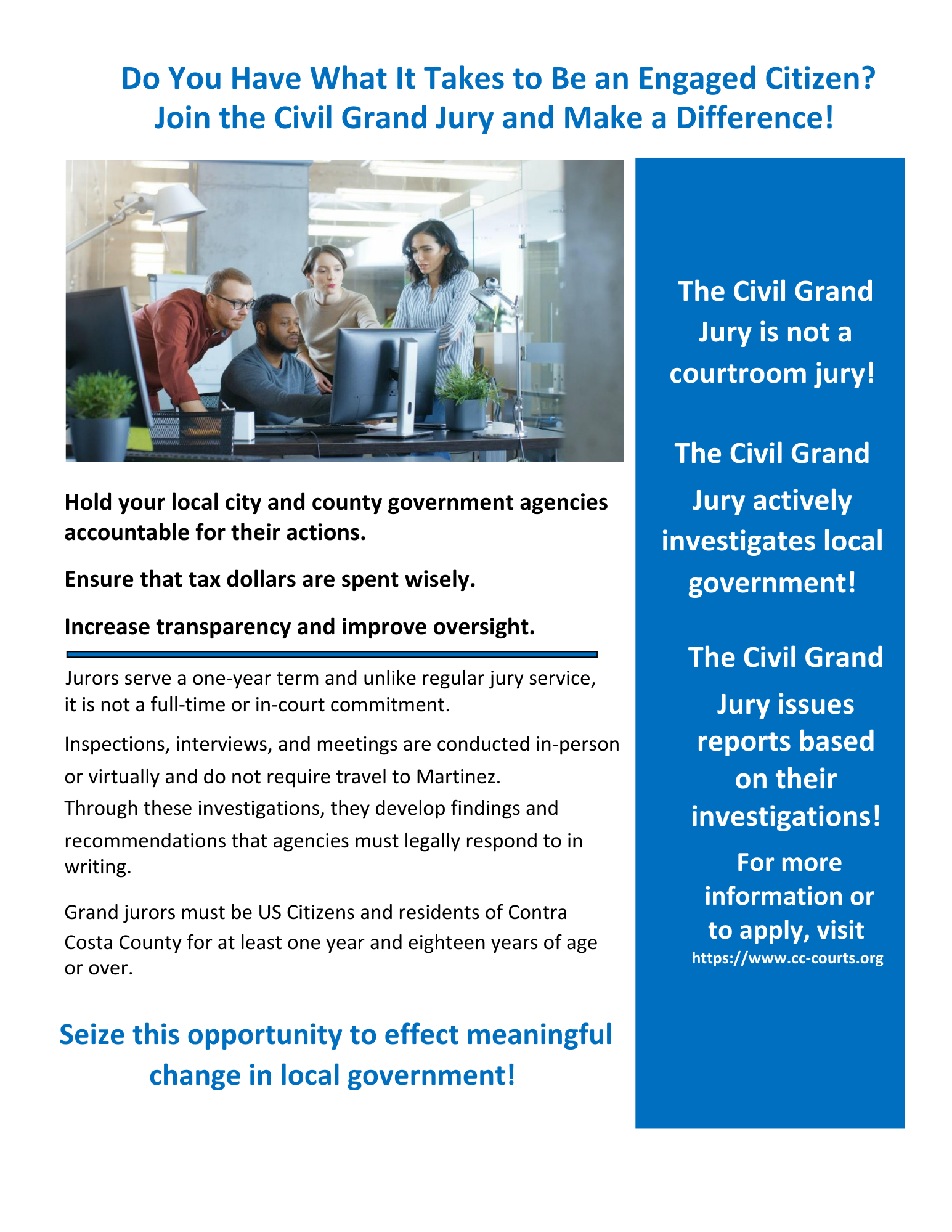 Among the powers and responsibilities of the Grand Jury is the investigation of referrals and complaints submitted to the Jury. This process helps to ensure that all branches of county and city government are being administered efficiently, honestly, and in the best interest of its residents and other interested parties. While the Grand Jury does not have enforcement authority, the Grand Jury issues Reports each term regarding the results of its investigations. Final Reports can be found at Grand Jury Reports | Superior Court of California |County of Contra Costa